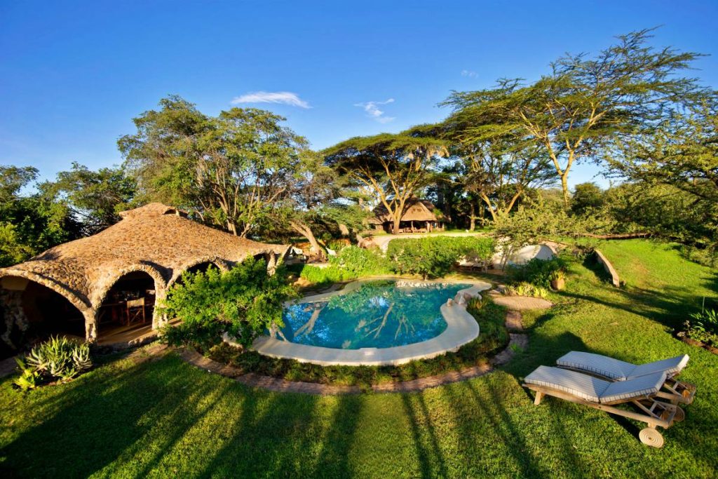 The main house serves as the communal hub, featuring a spacious lounge with an open fireplace and a large family dining table where guests can enjoy hosted meals. A shaded veranda extends from the main house, providing a comfortable seating area to relax and soak in the surroundings. The lodge also boasts a free-form swimming pool overlooking a waterhole, offering guests the chance to observe wildlife while taking a refreshing dip. Lewa House offers a range of activities to immerse guests in the natural beauty and culture of the region. These include day and night game drives, guided bush walks, horse and camel safaris, and cultural visits to local communities. Guests can also engage in conservation activities, such as visiting the anti-poaching tracker dogs and local schools supported by the conservancy.