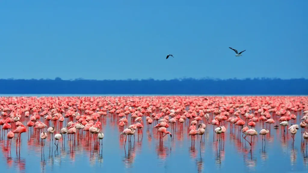 Embark on a picturesque drive to Lake Nakuru National Park, located in the heart of the Great Rift Valley. This park is famed for its stunning landscapes, shimmering alkaline lake, and abundant birdlife. Upon arrival, set out on a thrilling game drive to spot thousands of flamingos painting the lake’s shoreline pink. The park is also home to black and white rhinos, Rothschild giraffes, lions, and leopards. Enjoy a peaceful evening at your lodge, surrounded by the breathtaking beauty of the park.
